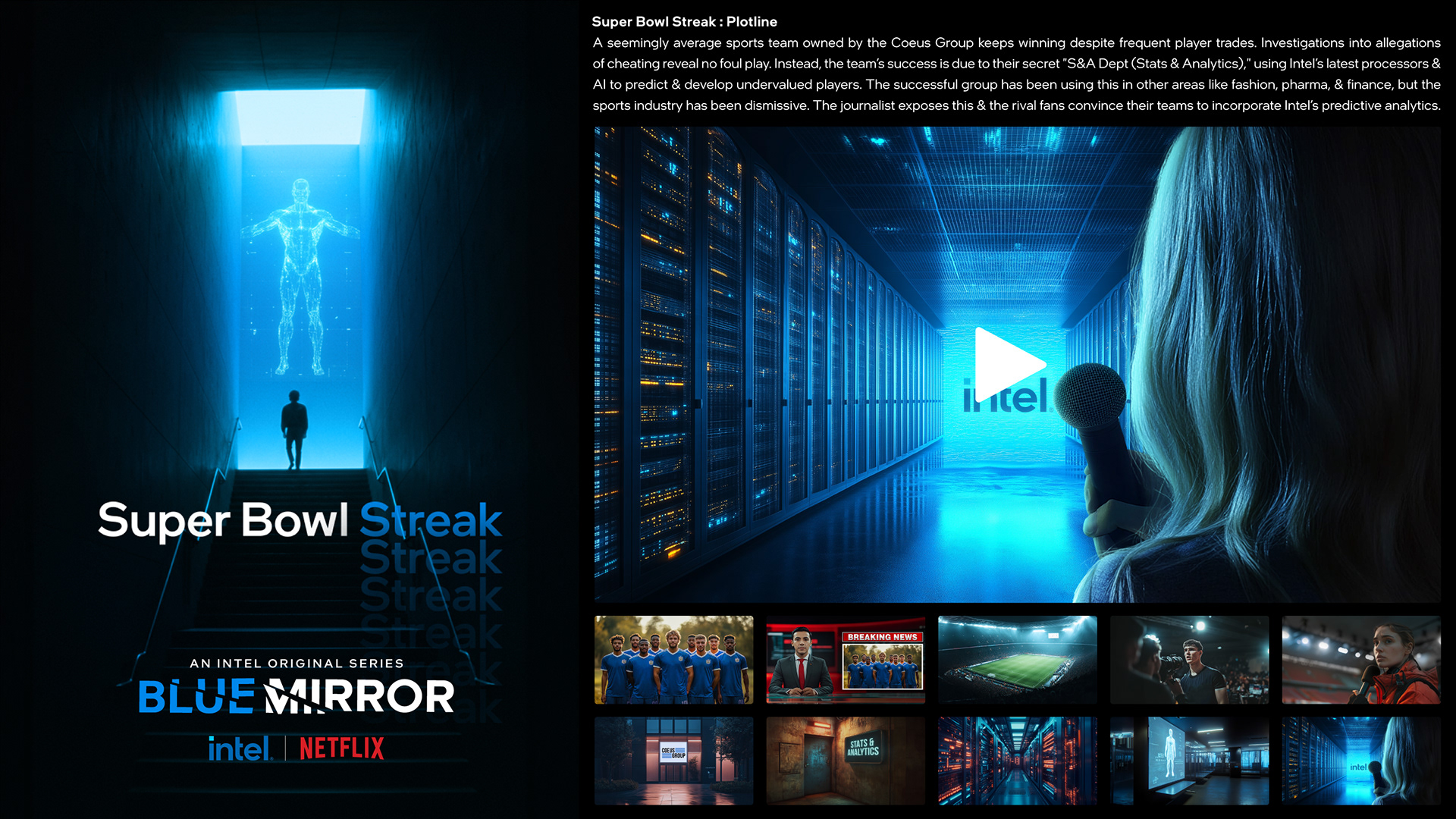 The core idea was conceived by my art partner, Maruthi Sivakumar. I developed the narrative worlds, plots, and the name. We collaborated closely with Dentsu New York leadership, including Timothy Gunatilaka, navigating time zones and late-night working sessions. The work received strong endorsement from Intel’s Chief Communications Officer, Karen Kahn, who called it “super exciting work”.
