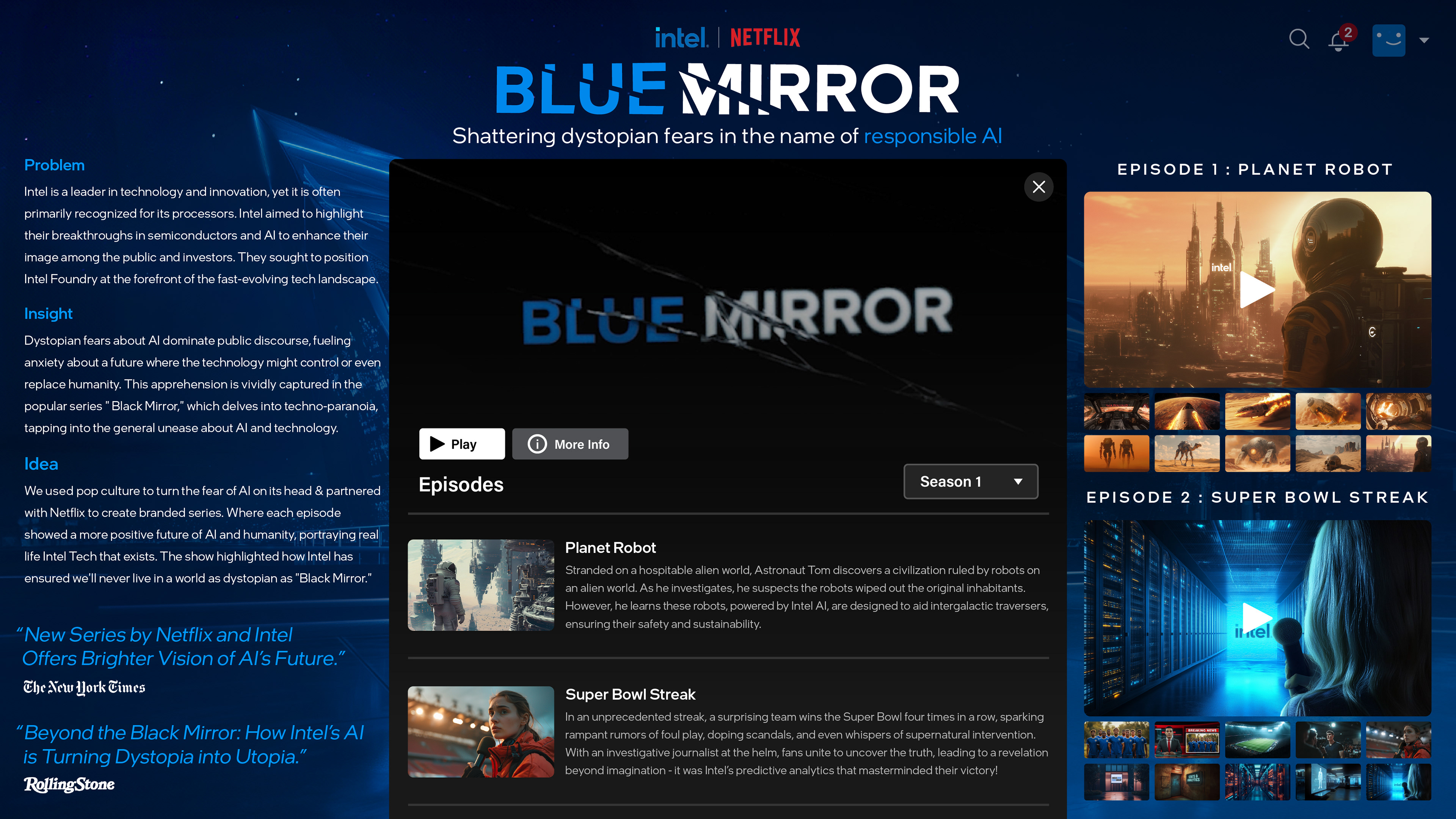 At a time when fear around AI was peaking, we chose to confront it head-on. By partnering with Netflix and its iconic series Black Mirror, a show known for dystopian futures, we flipped the narrative. Staying true to the show’s dark, unsettling tone, we revealed how Intel-powered AI could act as a safeguard for humanity, not a threat. Grim on the surface, reassuring at the core.